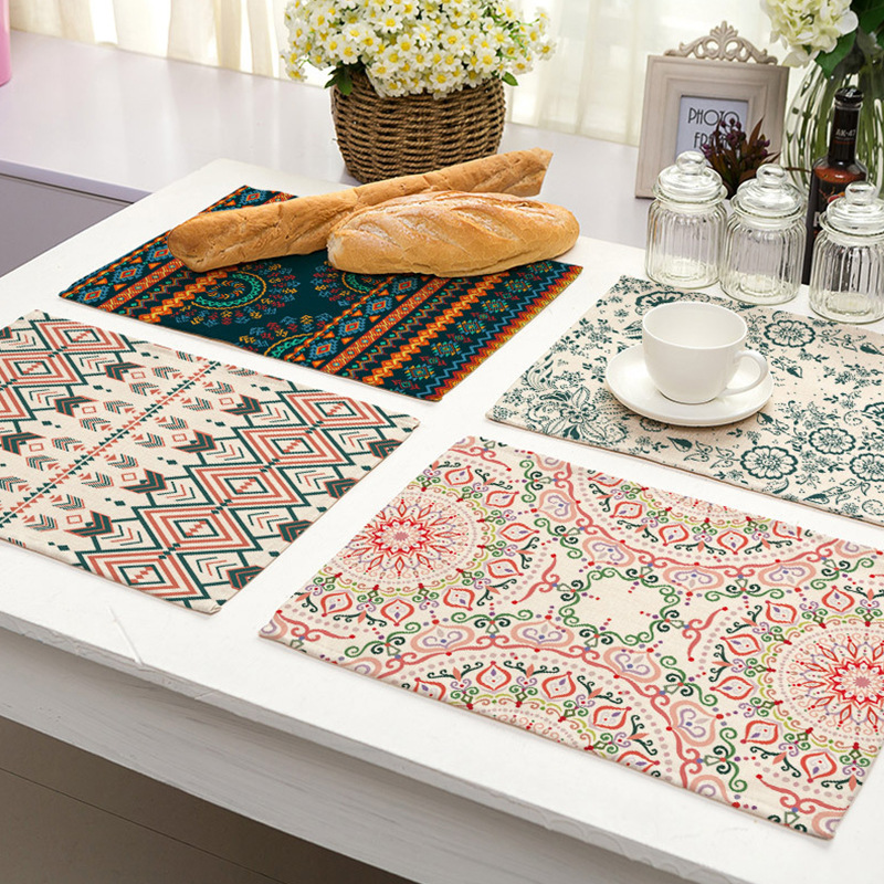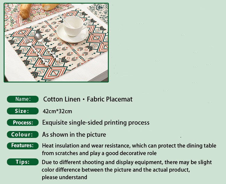 Our elaborately designed placemat geometric printed cotton linen insulated Western placemat will add a touch of artistic color to your dining table. Using high quality cotton and hemp fabric material, soft, comfortable and durable. Unique geometric print design, showing the perfect combination of fashion and personality. More importantly, it has thermal insulation, effectively protecting your desktop from hot objects. Not only that, but it’s easy to wipe and clean. This placemat can be used to create a warm and fashionable place to eat, whether it is a daily meal or a banquet. Add a touch of art to your table!