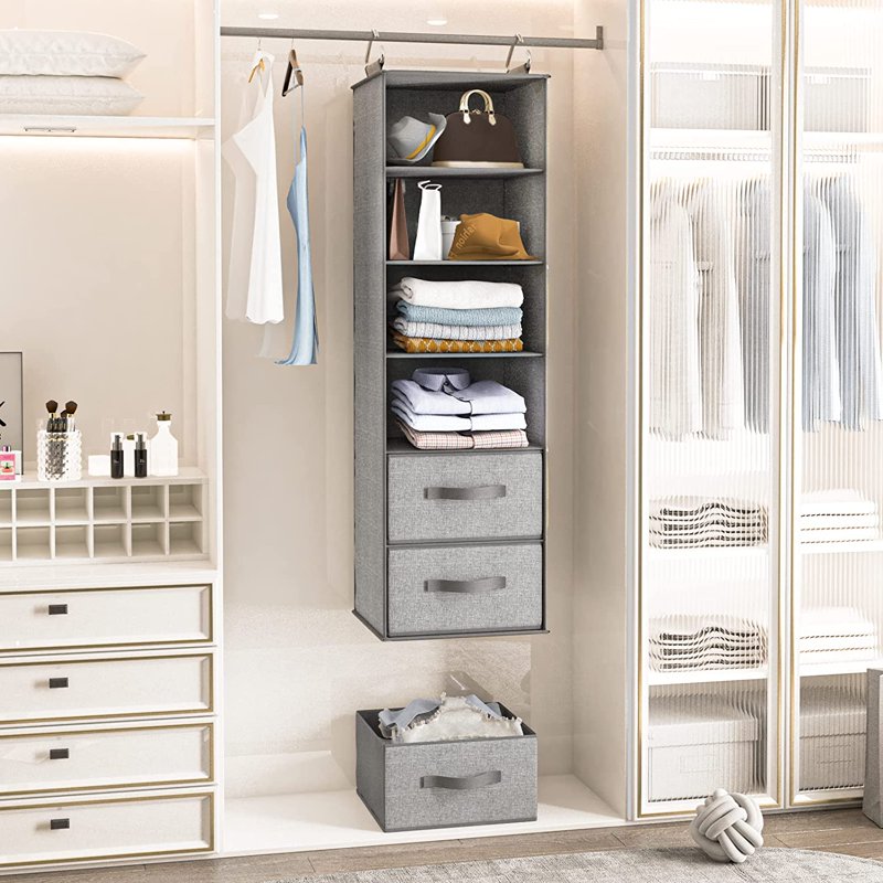 Creates additional large storage space: Our hanging closet unit measures approximately 11.4” x 12” x 43.3” in size. The hanging storage organizer has 6 compartments, 3 removable drawers and mesh storage pockets. You can utilize the organizer to store sweaters, shirts, pants, , purses, towels, gloves, and hats to make the most of your closet space. Our hanging shelves storage organizer gives you enjoyable closet management