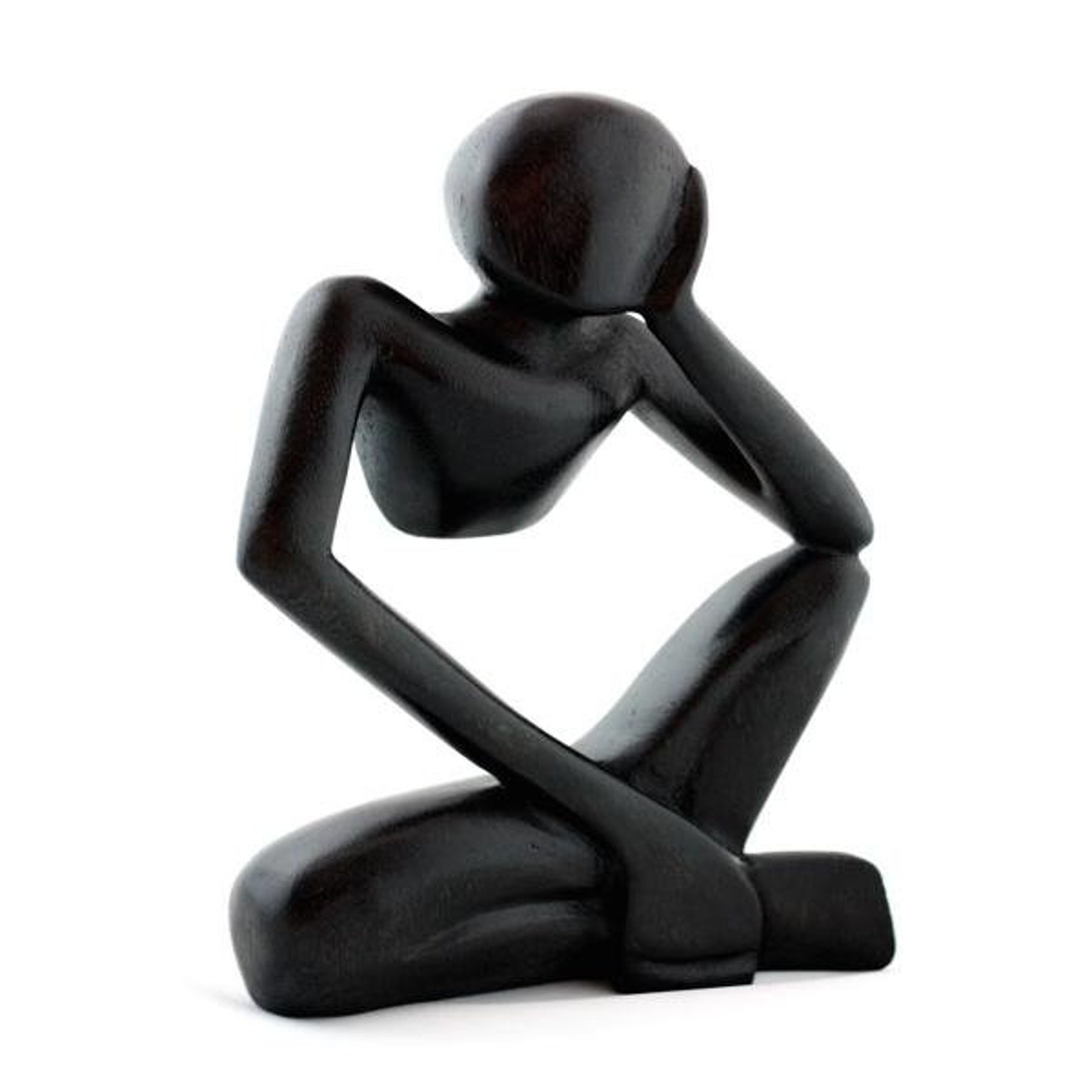 This hand-carved wooden statue shows a man seems to be thinking about something. The man’s head is balanced on his hand in a classic pose of rest, with only the elbow connecting to the knee on the bottom part of his body. The smooth lines of his folded legs and arms make for an attractive statue. Use this art piece as a decorating piece for any home or office that you wish to turn into an attraction.
