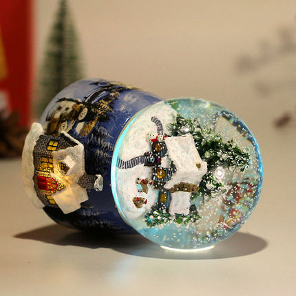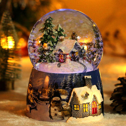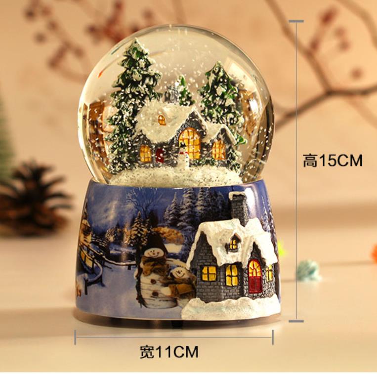 The diameter of the snow globe is 10 cm, the height with the stand is 15 cm.