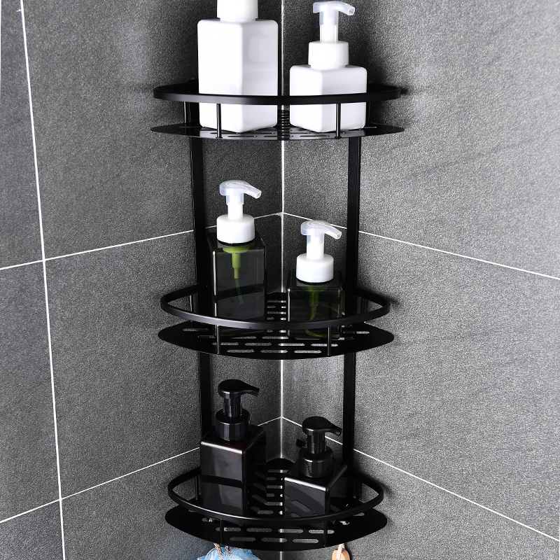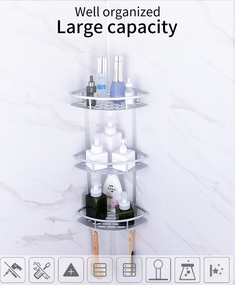 - A three-tier corner shower caddy is ideal for restroom storage