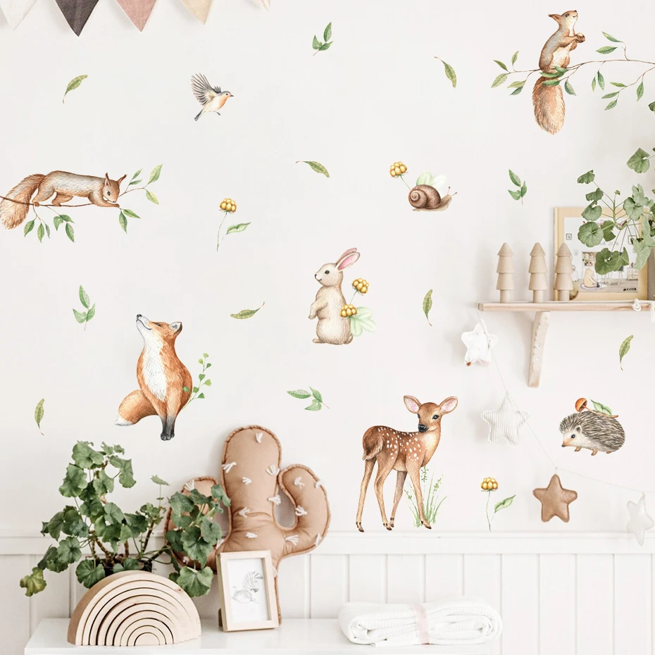 Boho Caroon Cute Deer Rabbit Woodland Animals Leaf Watercolor Nursery Wall Decals Kids Room Girls Bedroom Sticker Home Decor