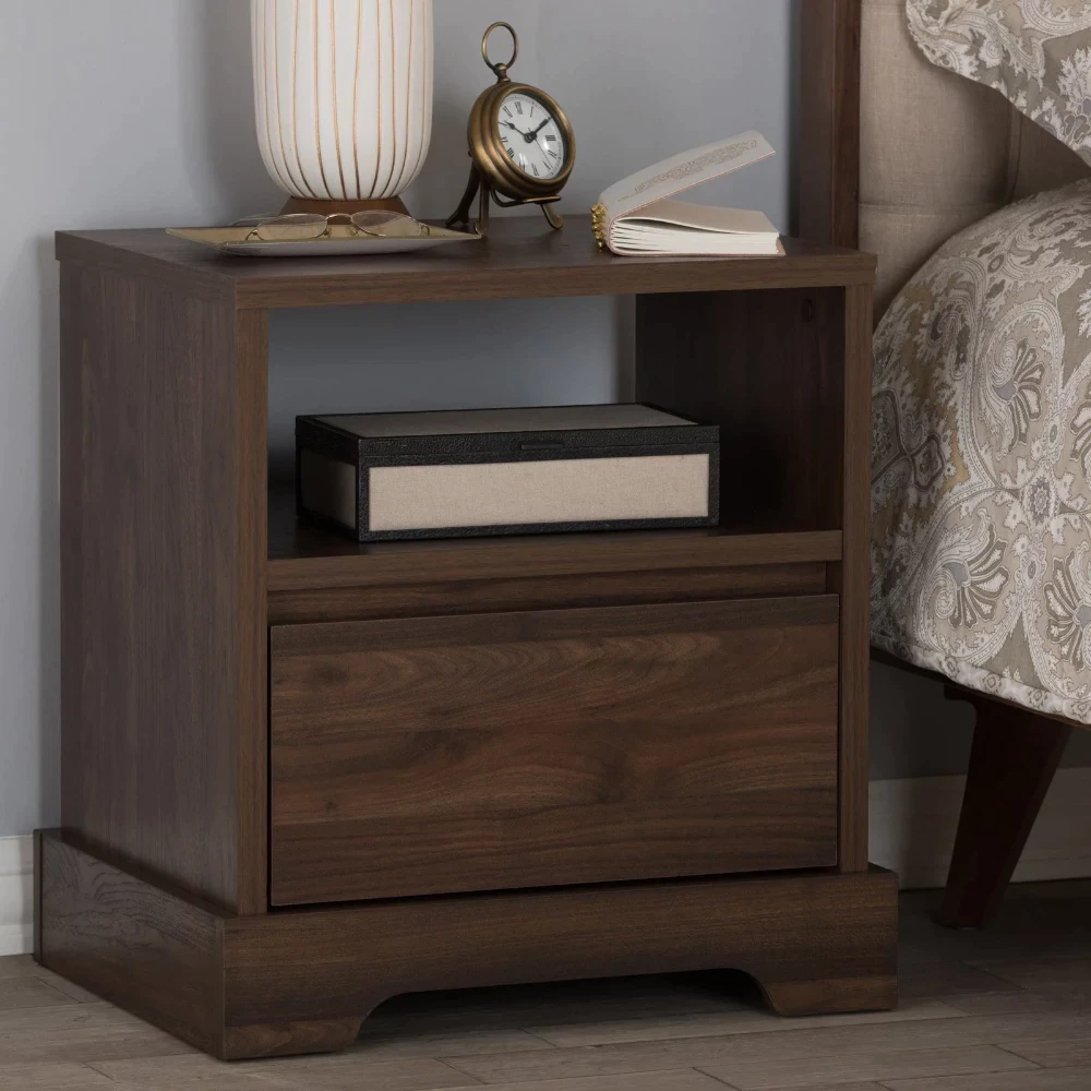 - Update your bedroom by adding the Boussac Modern and Contemporary Walnut Brown Finished Wood 1-Drawer Nightstand. This durable nightstand is made from engineered wood in a walnut brown finish. Engineered wood is specifically designed to withstand wear and years of use. This nightstand has an open shelf and drawer for storage. The contemporary design gives a refreshed look to your space.