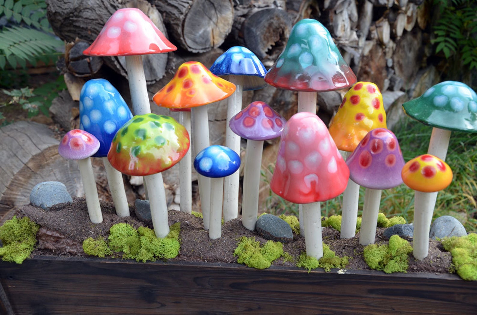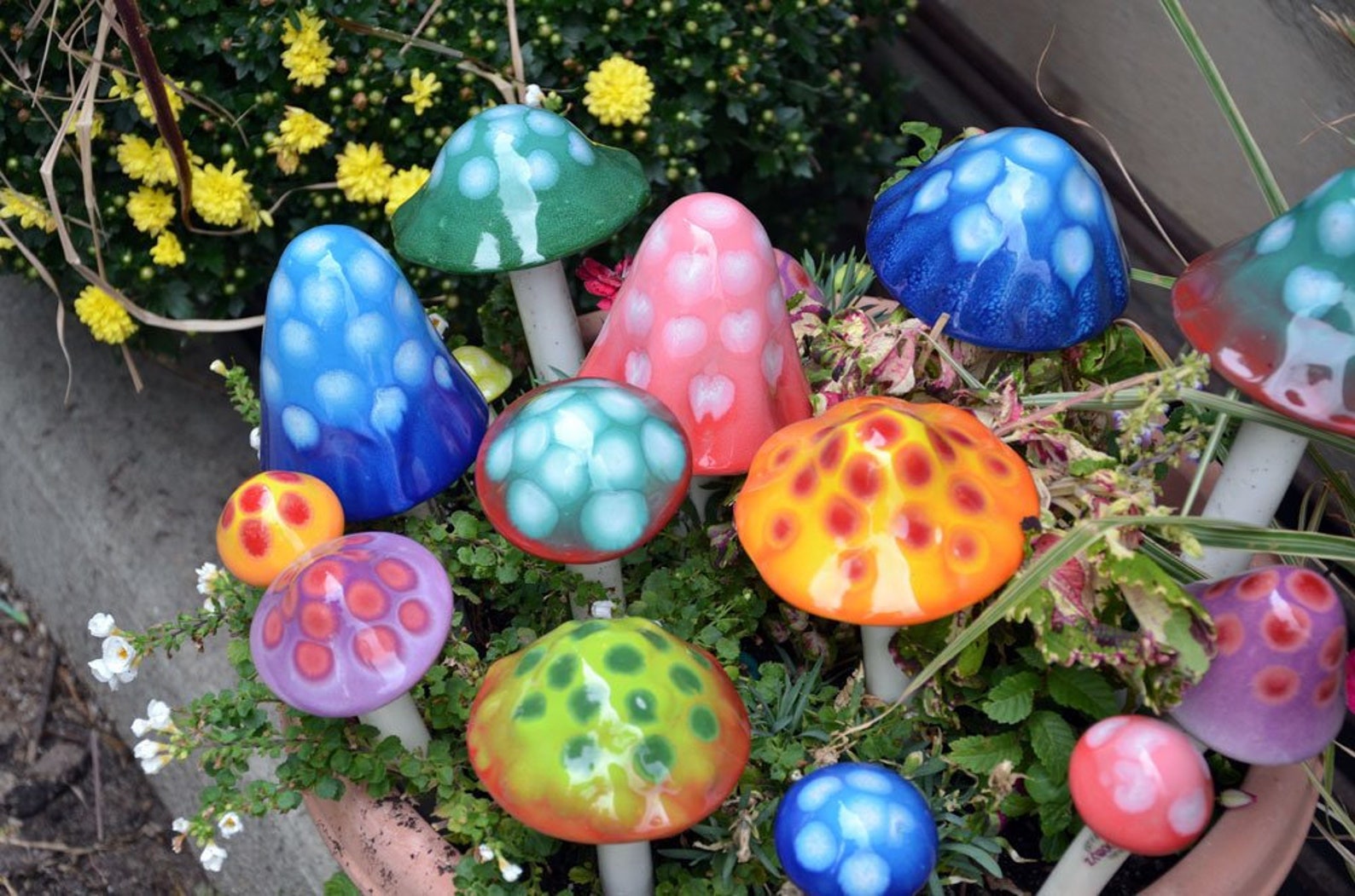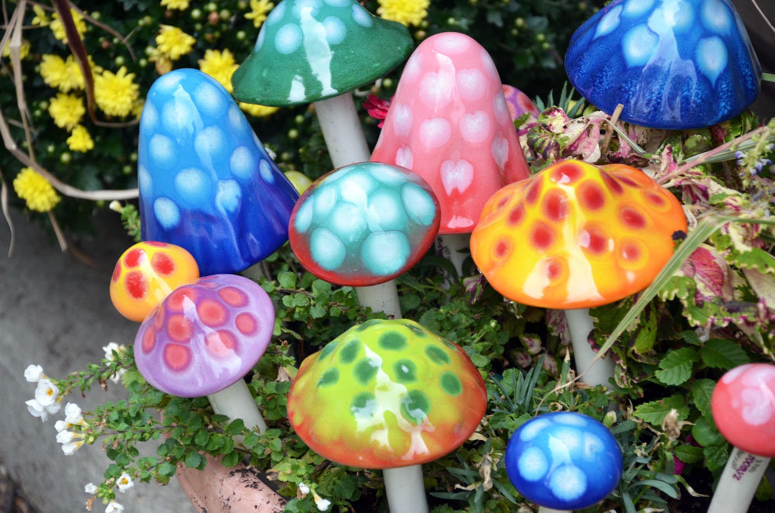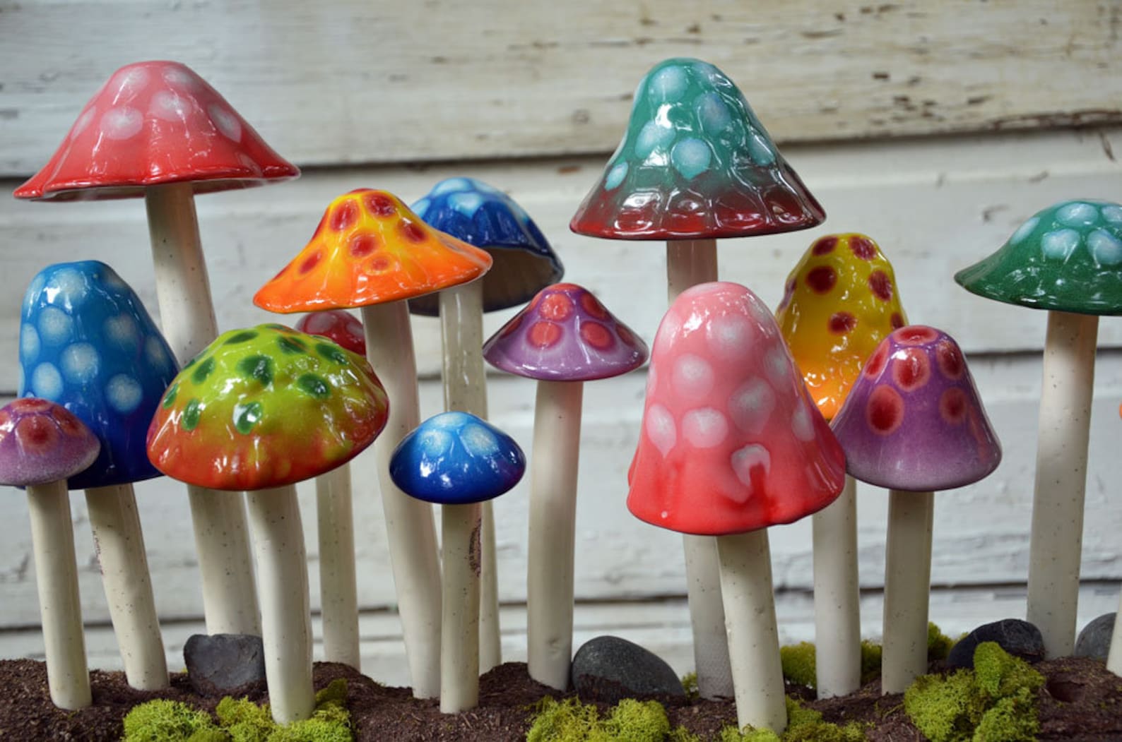 Check out our new Gumdrop Collection! It’s new and improved! Missing that green thumb, but want great color in your yard, flowers or pots? A gardeners must have! Shroomyz add an instant “pop” of vibrant color! Each ceramic mushroom is individually handcrafted by artisans in Utah – Shroomyz are a product of RooPottery. Circumference of “tops” varies from 2″ – 6.5″ depending on style and size. Will not fade in the sun. Shroomyz are now frostproof and can be left outside all year long!