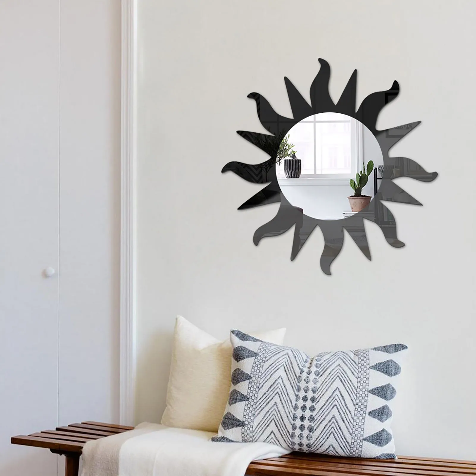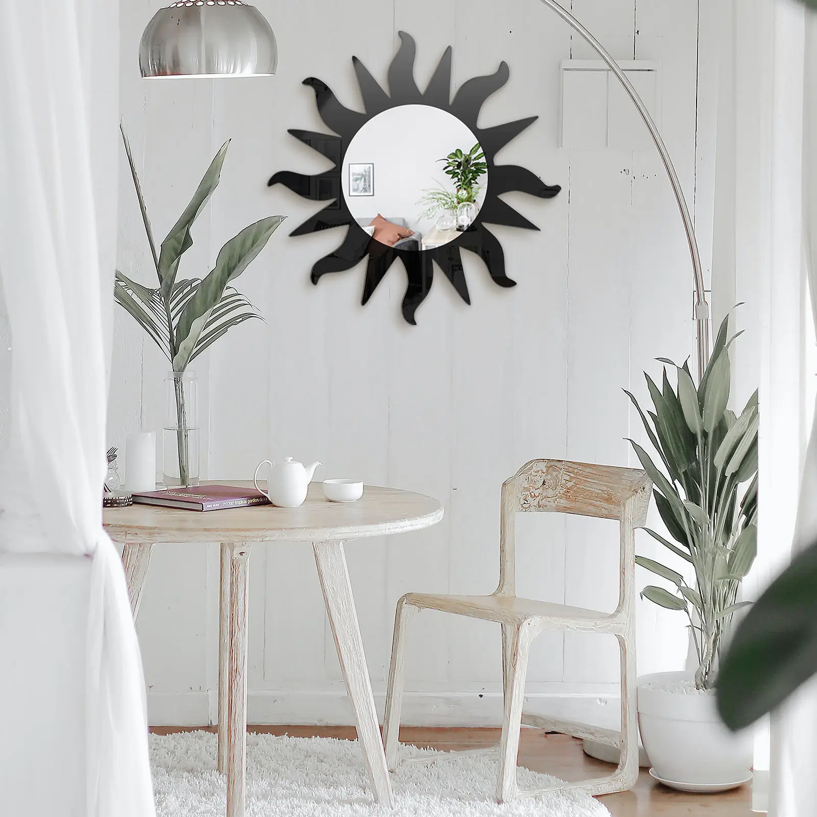 Sun-shaped mirror made of acrylic sheet, unlike ordinary mirrors easily broken. It does not have the imaging effect of a mirror, they are just decorative items that add more beauty. When fixing the mirror to the wall, please remove the protective film of the mirror.