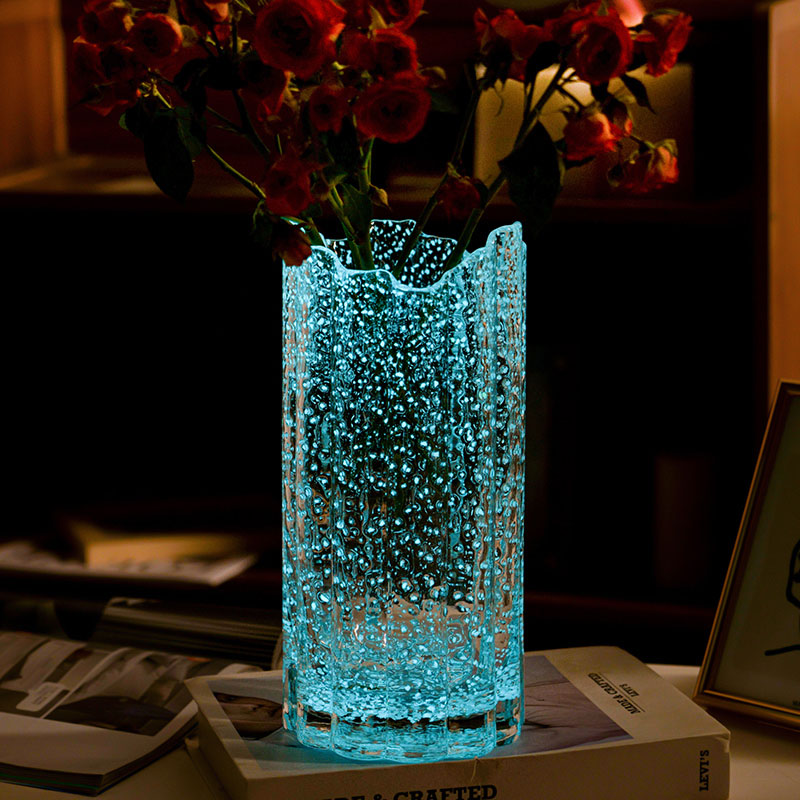 The vase is translucent during the day or under lights, but glows when the environment becomes dark after the lights are turned off at night.