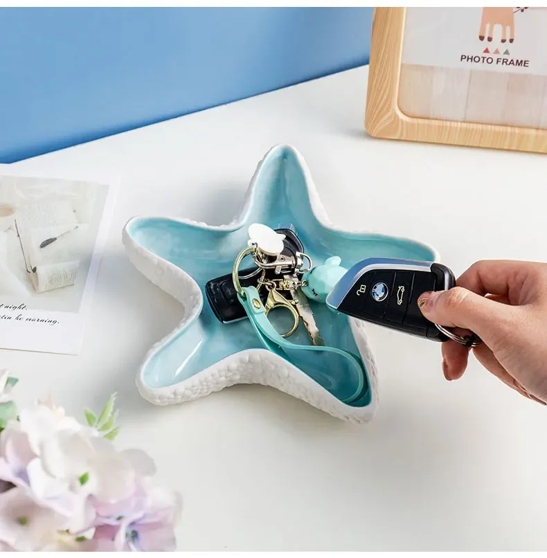Starfish key bowl: the ceramic jewellery bowl can help you neatly organise your food dessert and jewellery such as earrings, rings, bracelets, necklaces or cosmetics such as lipsticks, perfume, pressed powder, emulsion, essential oils and other cosmetics.