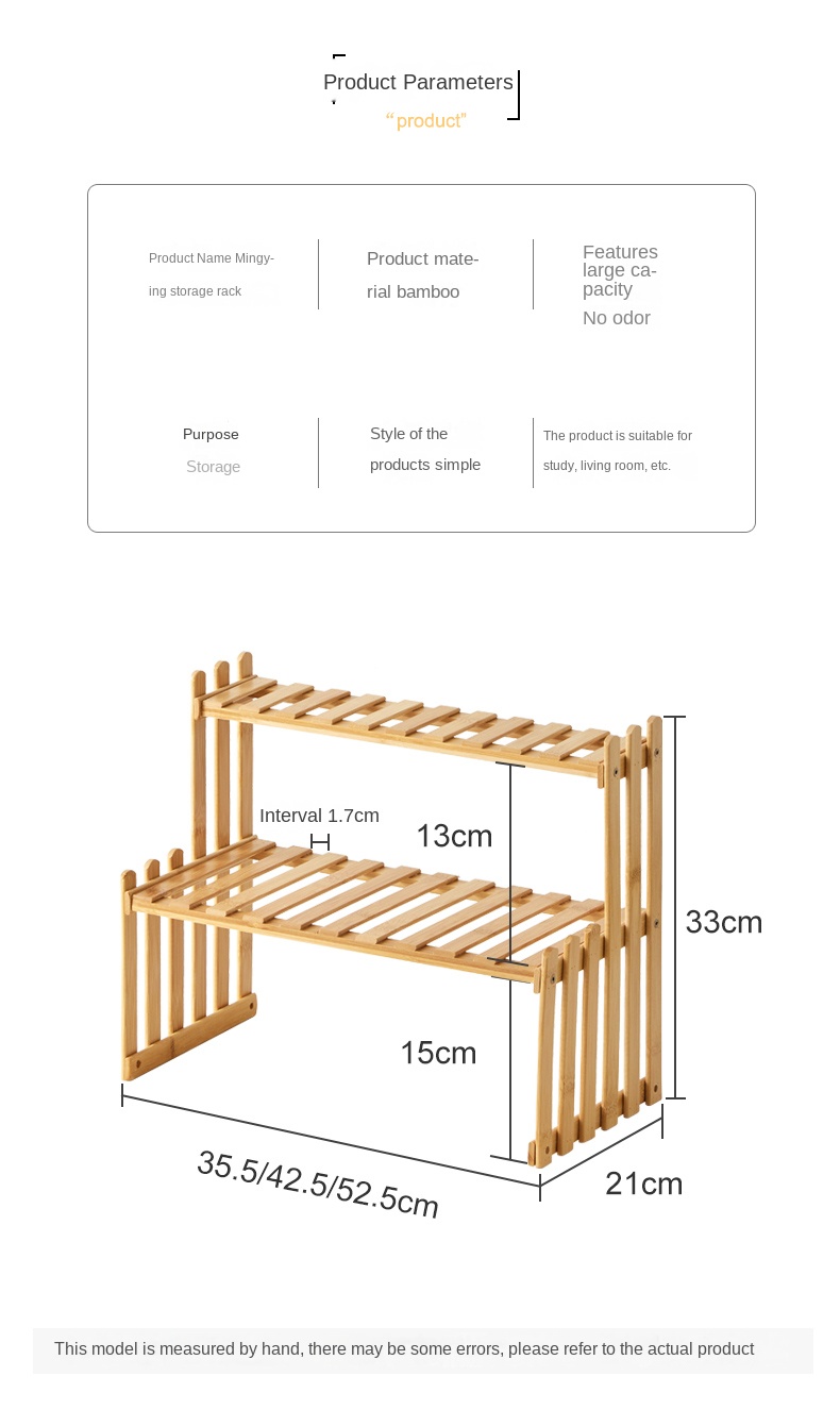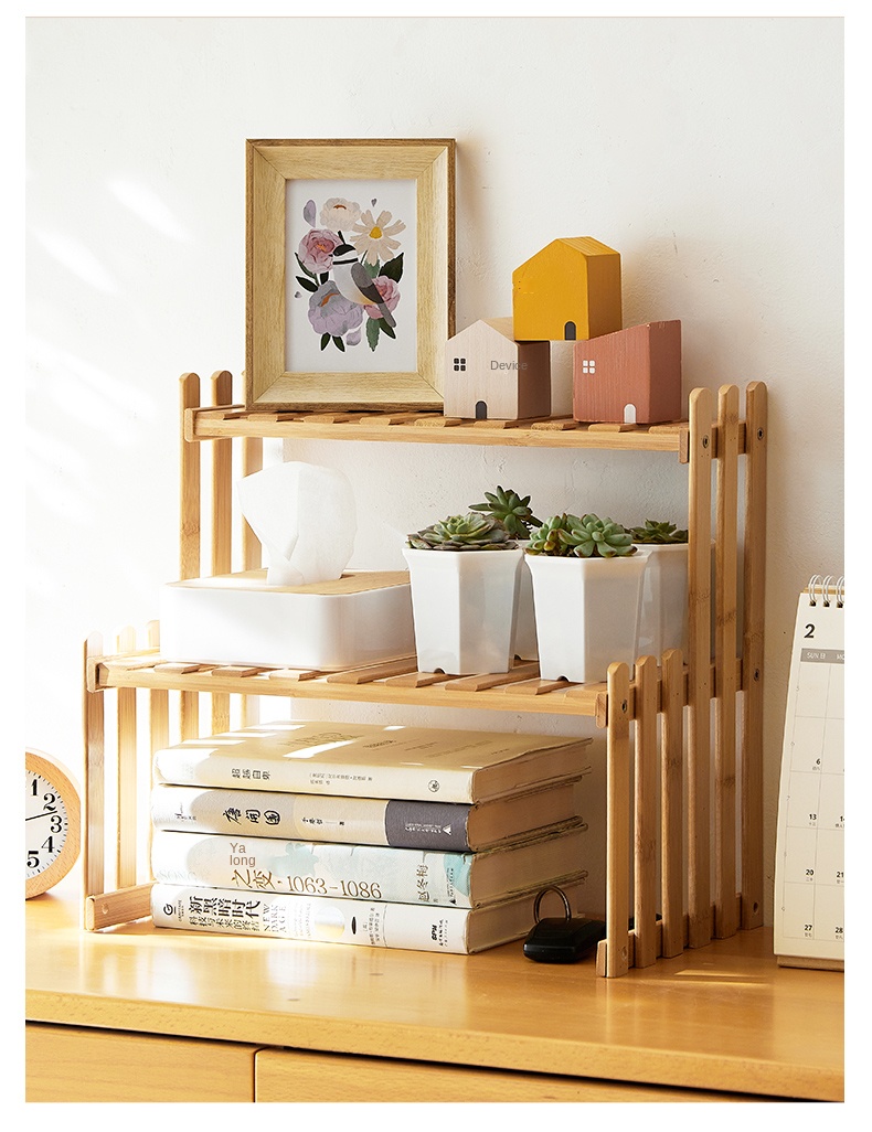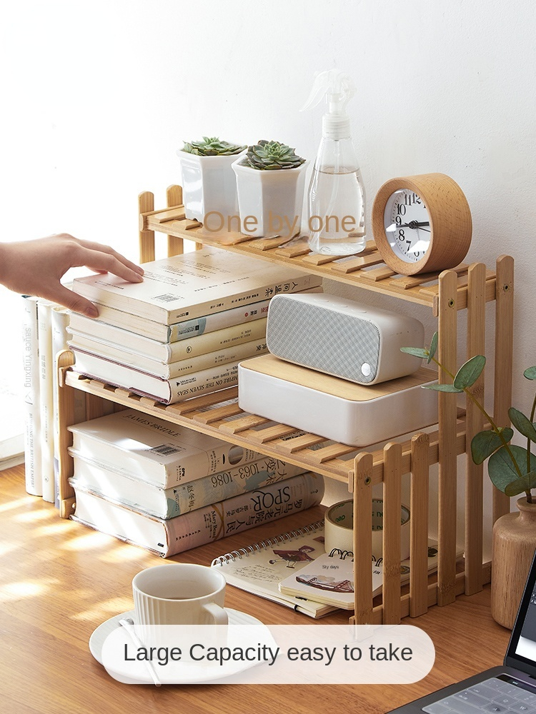 The double layer desktop bookshelf office data rack is a practical and efficient storage solution for your office or workspace. With two layers of shelves, it provides ample space to organize and store books, files, documents, and other office essentials. Its compact design allows it to fit neatly on your desktop, keeping everything within reach while maximizing space efficiency.