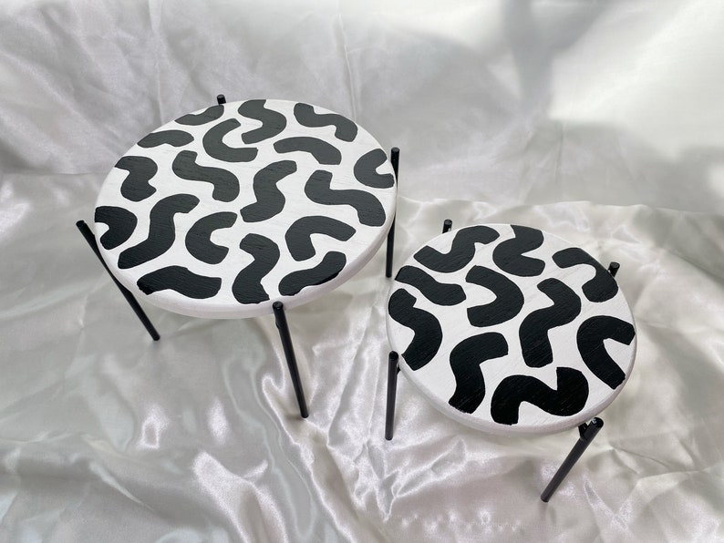 Small wooden decor table. Then it is air-dried and glazed with an acrylic finish to lock in color and seal. Sold individually or as a set. Perfect for small decor or as a plant stand to spice up your tablescape. Each piece is one of a kind. No piece is perfect and there may be small imperfections.