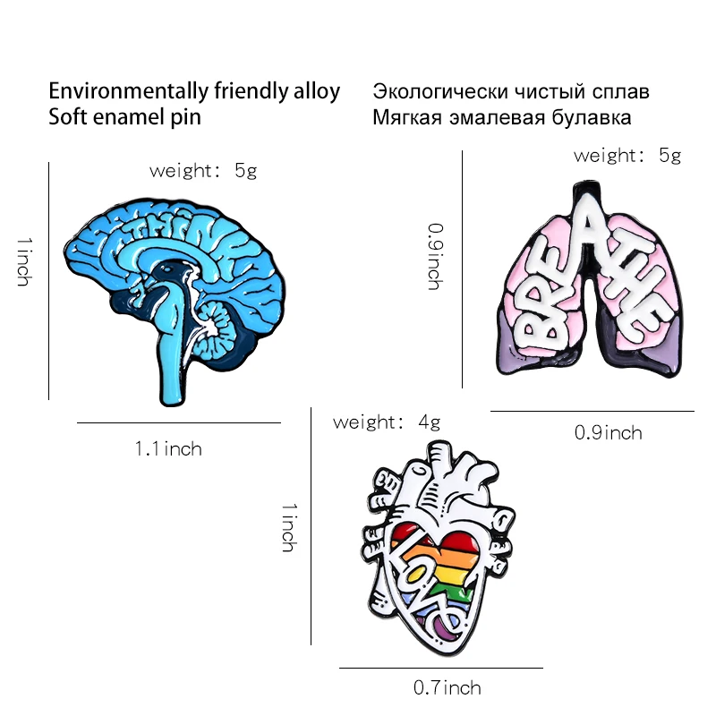 Heart Brain Lungs Metal Health Enamel Lapel Pins (3PCS/Set)
