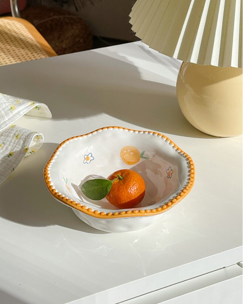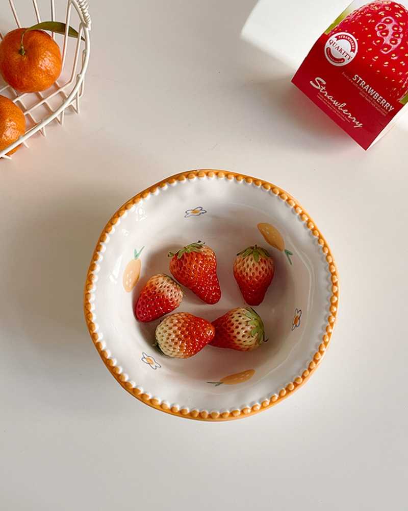 - Japanese-style small ceramic bowl with a cute orange color and retro lace pattern