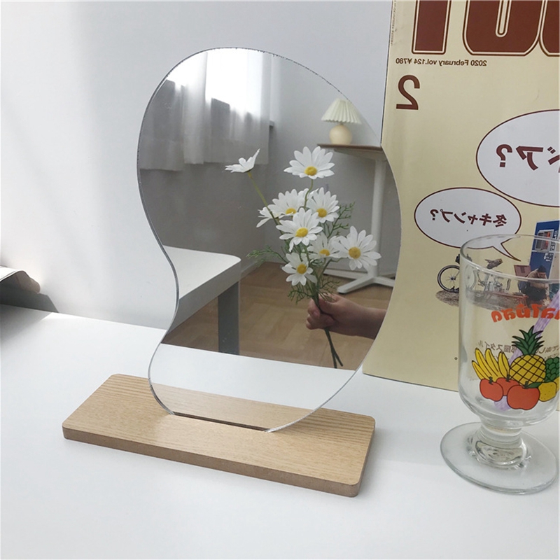 Acrylic mirror and wooden base. Insert the straight line of the mirror into the slot of the base, the mirror is transparent without distortion, and the design is simple, it looks perfect and suitable for use or decoration.