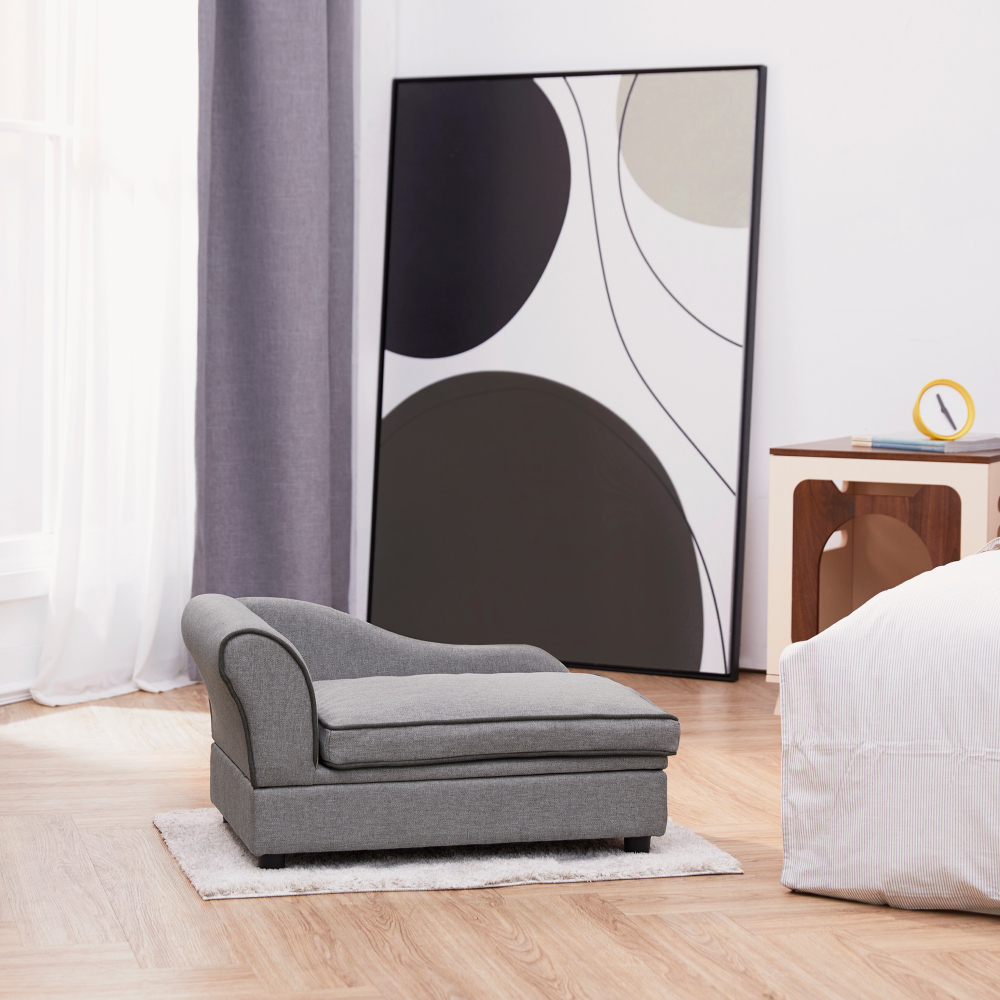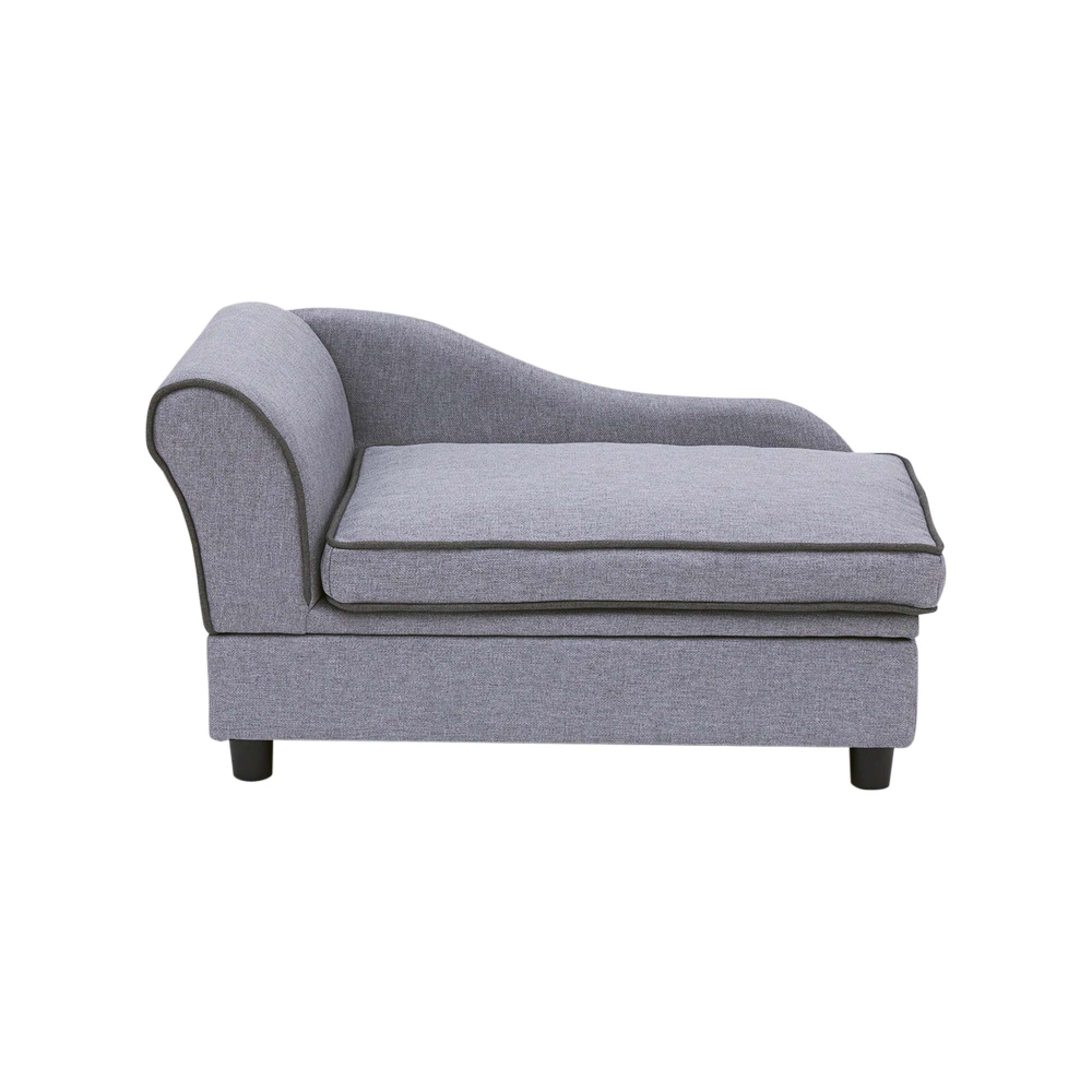 Included: Chaise-style bed for medium dogs features one arm and a scalloped back, removable cushion, and hidden storage compartment underneath.
