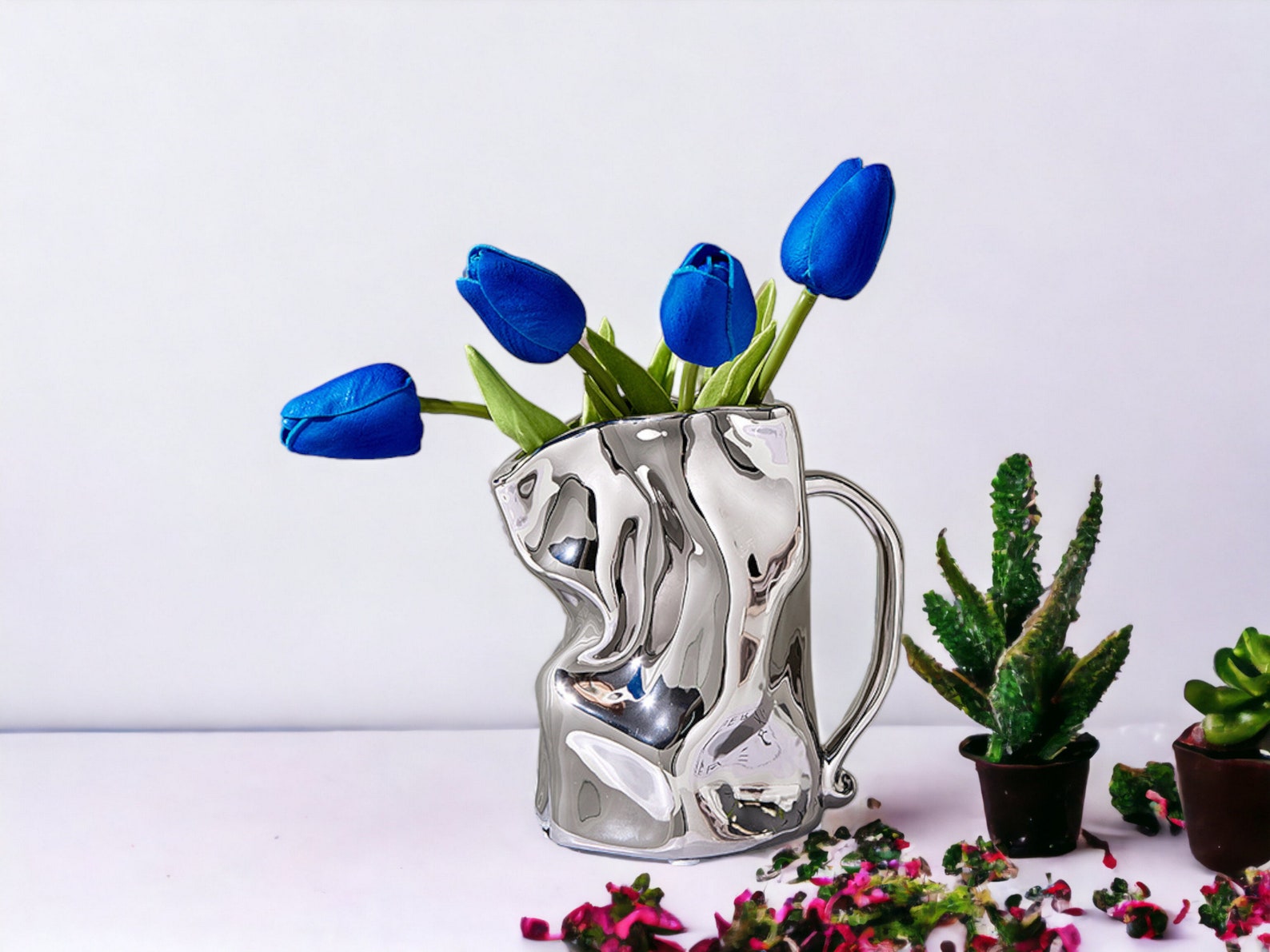 Introducing our stunning Melted Jug Ceramic Vase in Silver! This Vase the perfect gift for a modern home, designed to add a touch of charm to any living space. Its mirrored finish ensures a modern aesthetic while its shiny design creates a unique and eye-catching look.