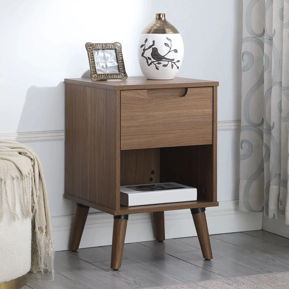 Keep your bedroom essentials within arm’s reach with the Modern Nightstand with Drawer. This Nightstand is a convenient addition to your bedroom as it not only provides extra storage space, but the modern simple style and beautiful walnut finish fits into any style of room with any existing decor. This nightstand is constructed of laminated wood for a cost effective build that is both trendy and functional. It with one drawer feature ball bearing slides that offers extra space that provides easy access for remotes, your favorite book and reading glasses, etc. With an open shelf under the drawer, you can stack of books, or any decorative item you wish to put on display. Use the top surface to place a lamp on, or use it to display a few accessories for added style. Assembled product size is 15.75″*15.75″*24″H. Pair this nightstand with other accent pieces from the Modern collection to create the bedroom haven of your dreams.