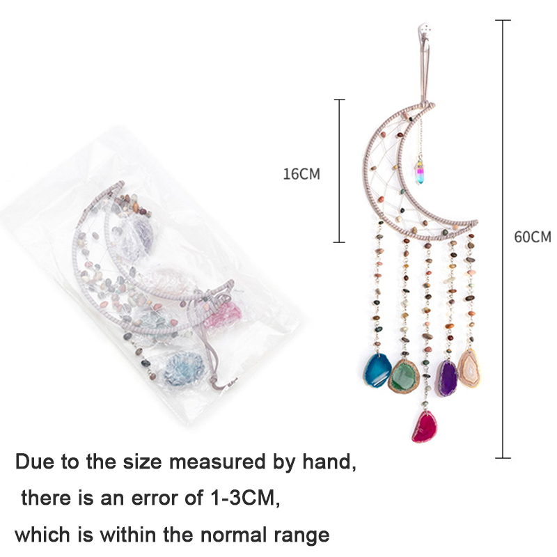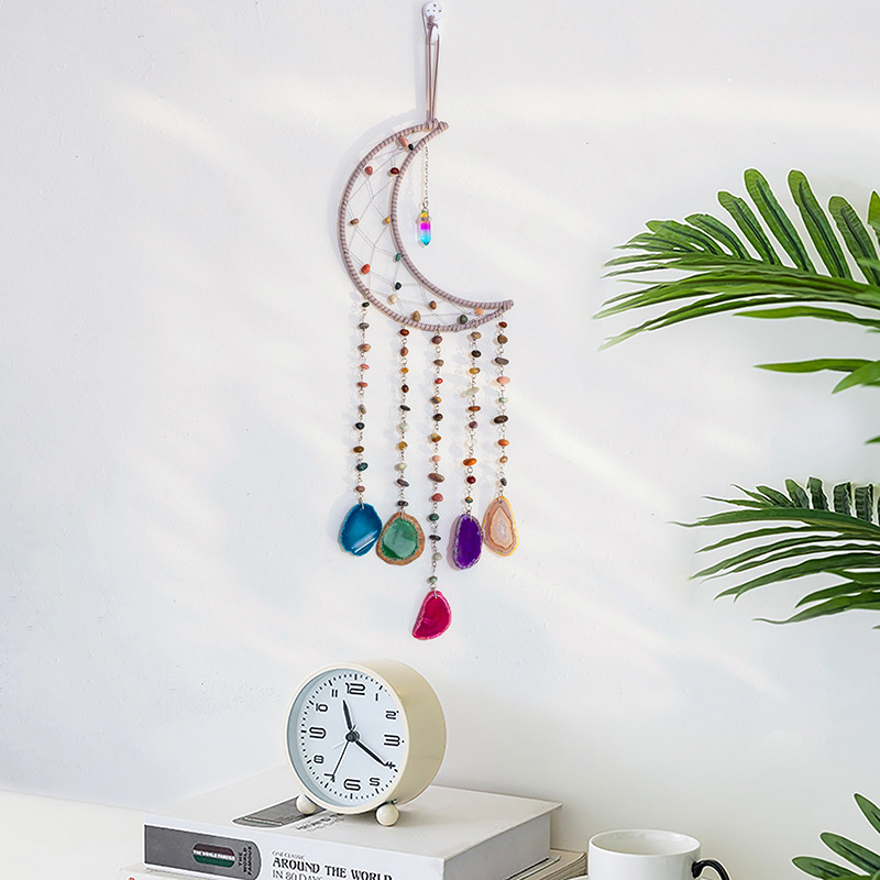 Celestial Elegance: The Moon Dream Catchers Agate 5 Chakra Color Gemstone is a stunning blend of celestial beauty and spiritual energy. Its moon-shaped design and vibrant gemstones create an enchanting centerpiece that enhances the aesthetics of any space.