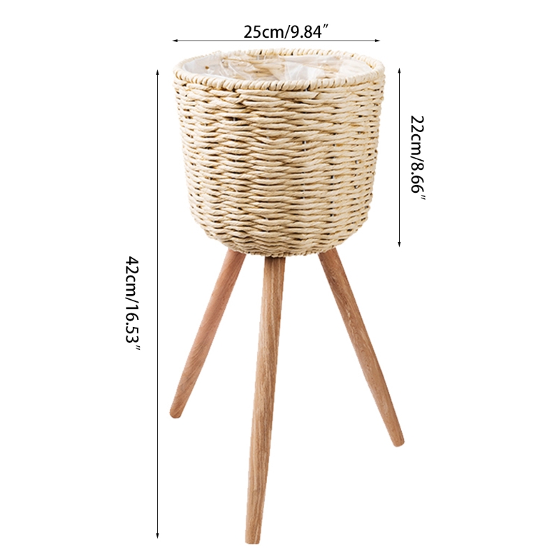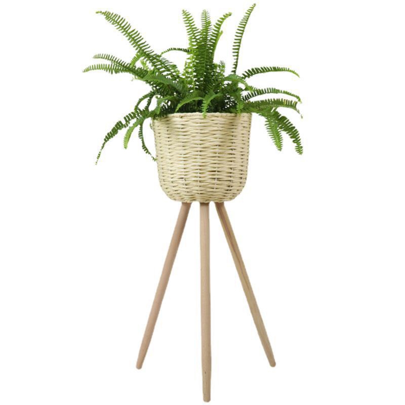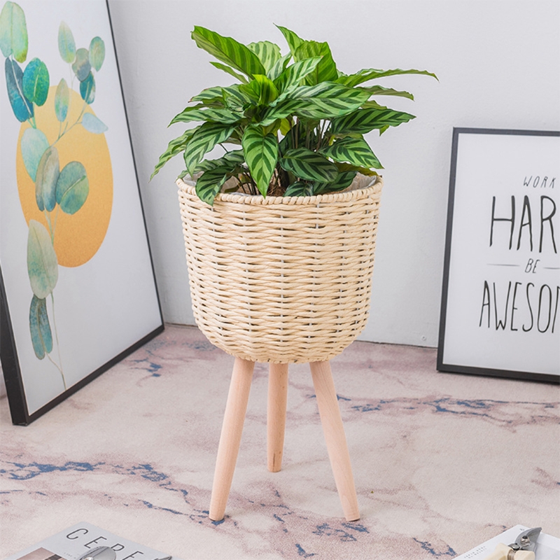 Nordic Style Floor Woven Round Flowerpot Plant Pot with Wooden