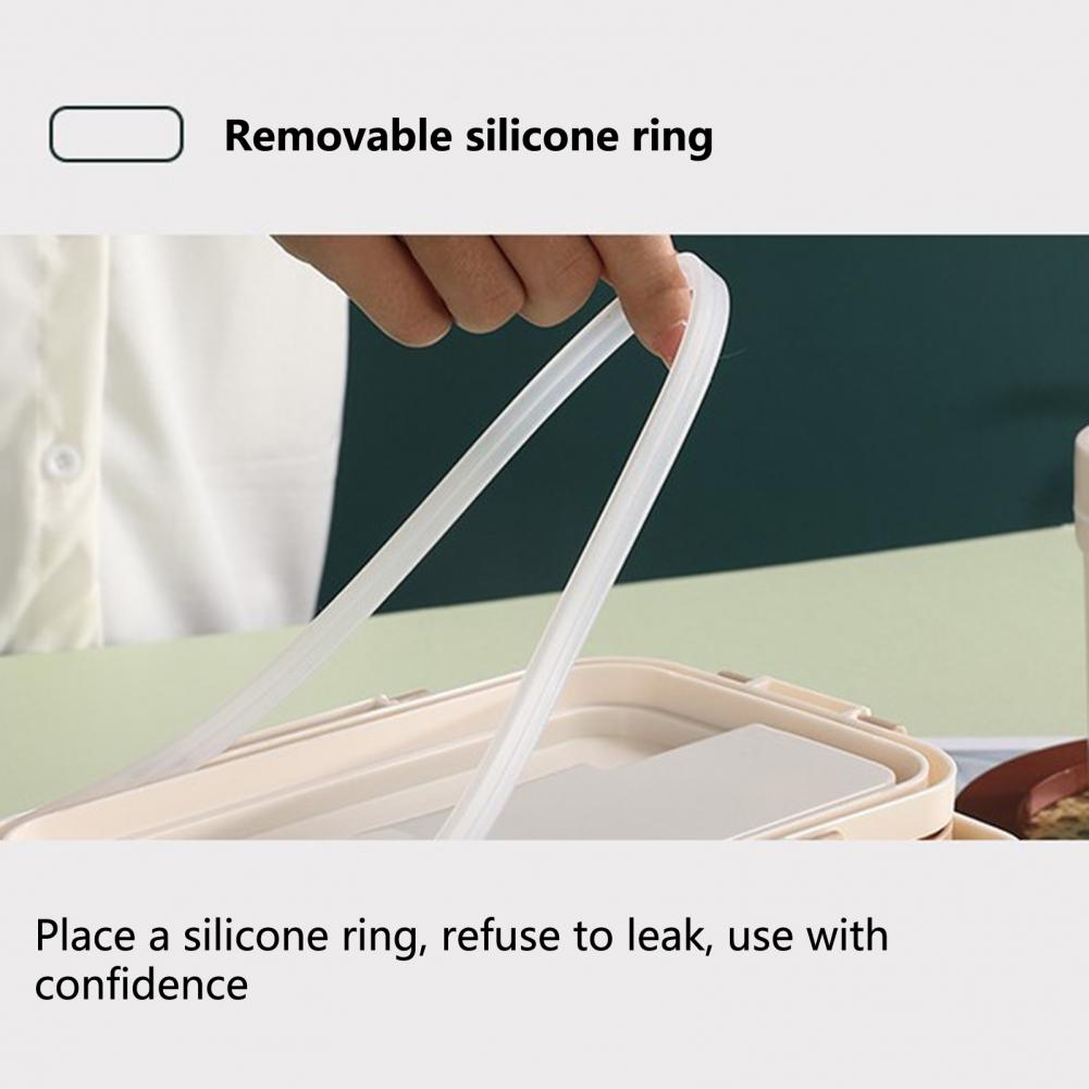 For effective sealing and leak prevention, this 3-grid lunch box has a detachable silicone ring, dust cover and snap closure.