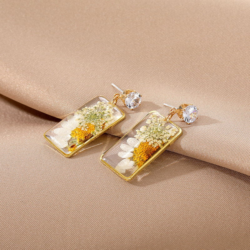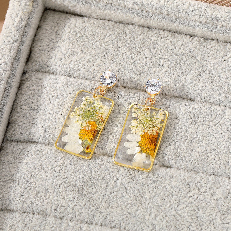 Rectangular Daisy Dried Flower Plant Drop Resin Epoxy Earrings