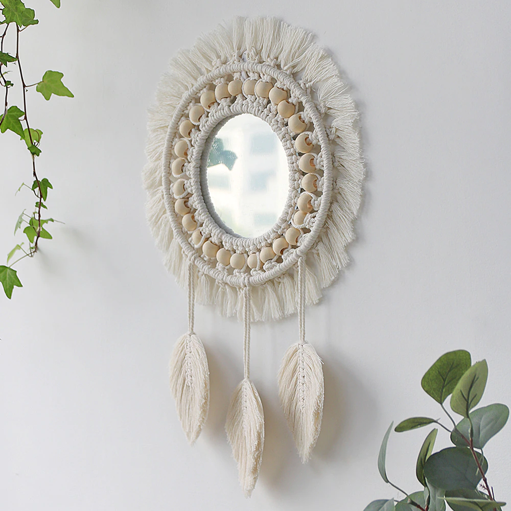 The round wall mirror macrame wall hanging add dimension to a space in your home. It will bring a Bohemian folk and vintage to your decor. Can be placed alone or stacked with others, it goes great with woven mirror. It’s an ornate wall mirror perfect for home decor in vintage rustic style.