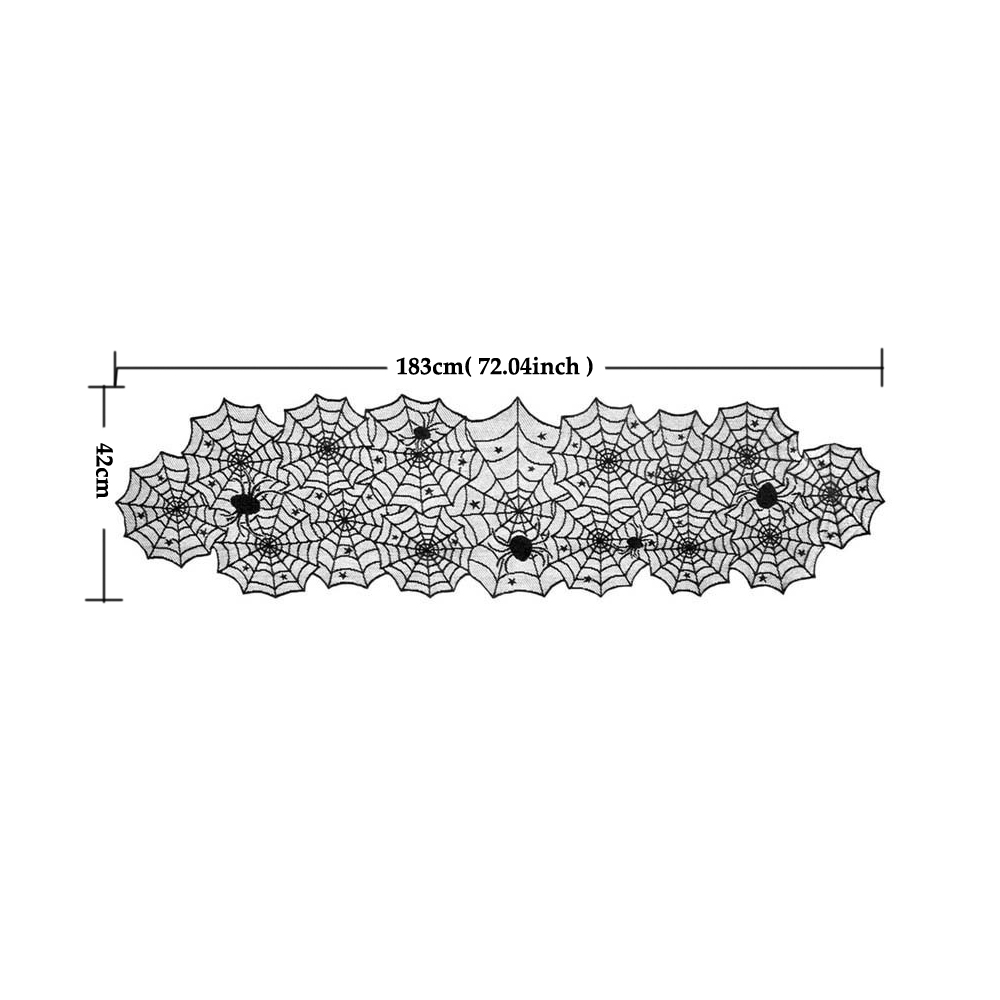 The lace tablecloth features a Halloween-themed design, specifically showcasing spider webs. The intricate lacework resembles spider webs, adding a spooky and decorative touch to your Halloween party setup.