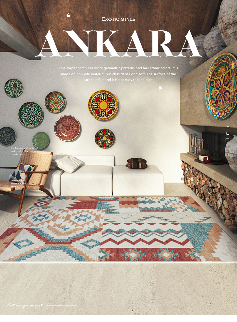 The carpet features a retro-inspired color palette, typically consisting of warm and earthy tones, which adds to its nostalgic appeal and blends well with various interior design styles.