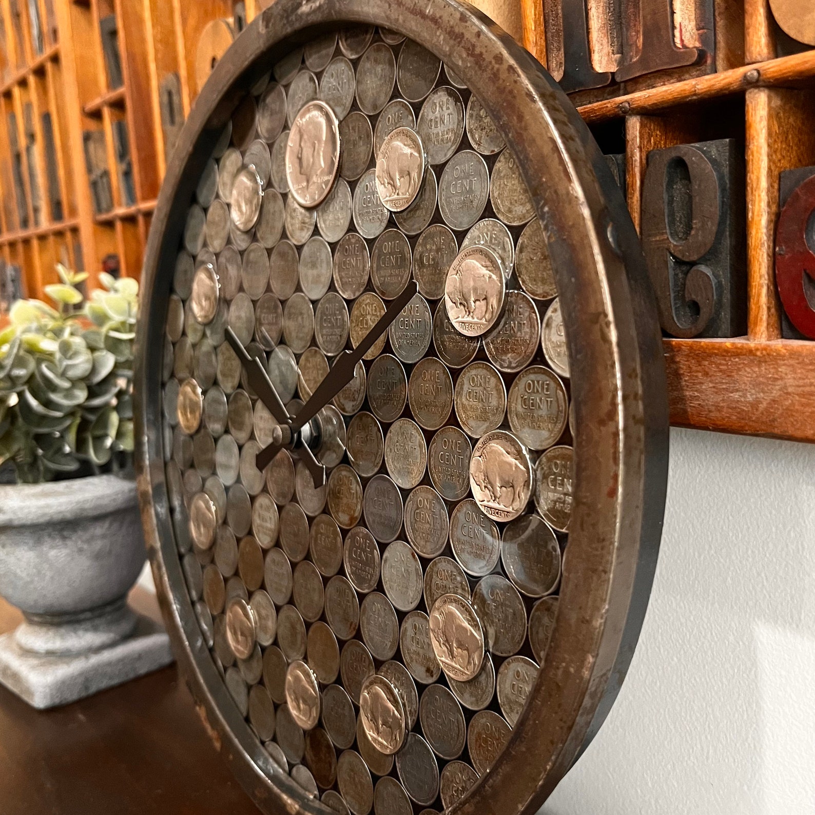 This unique wall clock is perfect for anyone who wants something a little different, a bit unusual. It makes an ideal gift for anyone interested in coin collecting, history or someone who works in the banking or finance industries. The face is constructed entirely of steel wheat pennies, which were minted in 1943 because copper was needed for the war effort. The 12:00 hour is marked by a Kennedy Half Dollar. All other hours indicated Buffalo Nickels. All coins are sealed to protect color.