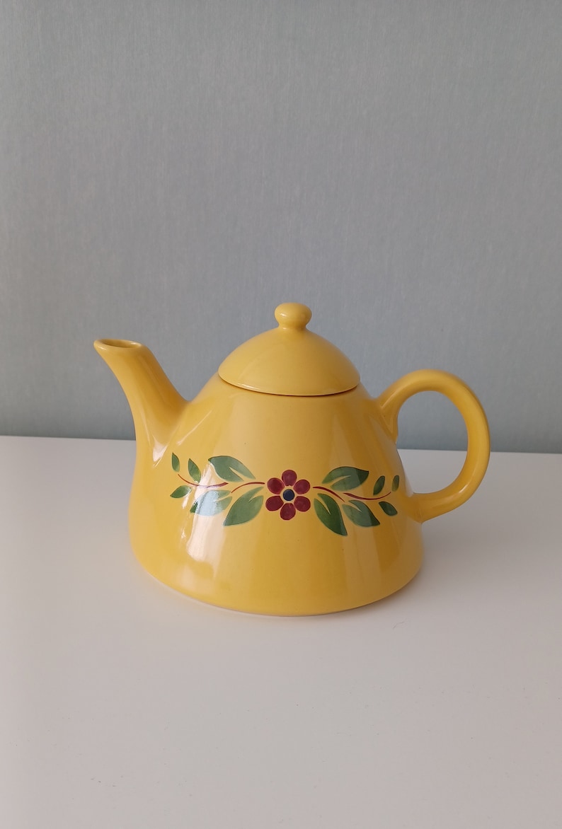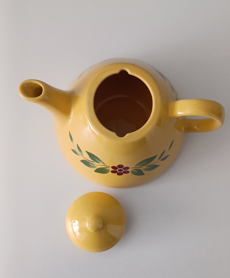 The pot is hand-painted with a beautiful floral pattern and has vibrant colorus—a sunny yellow base with green, blue, and burgundy floral patterns.