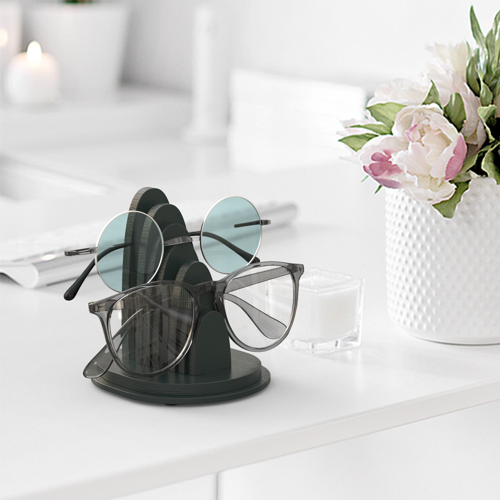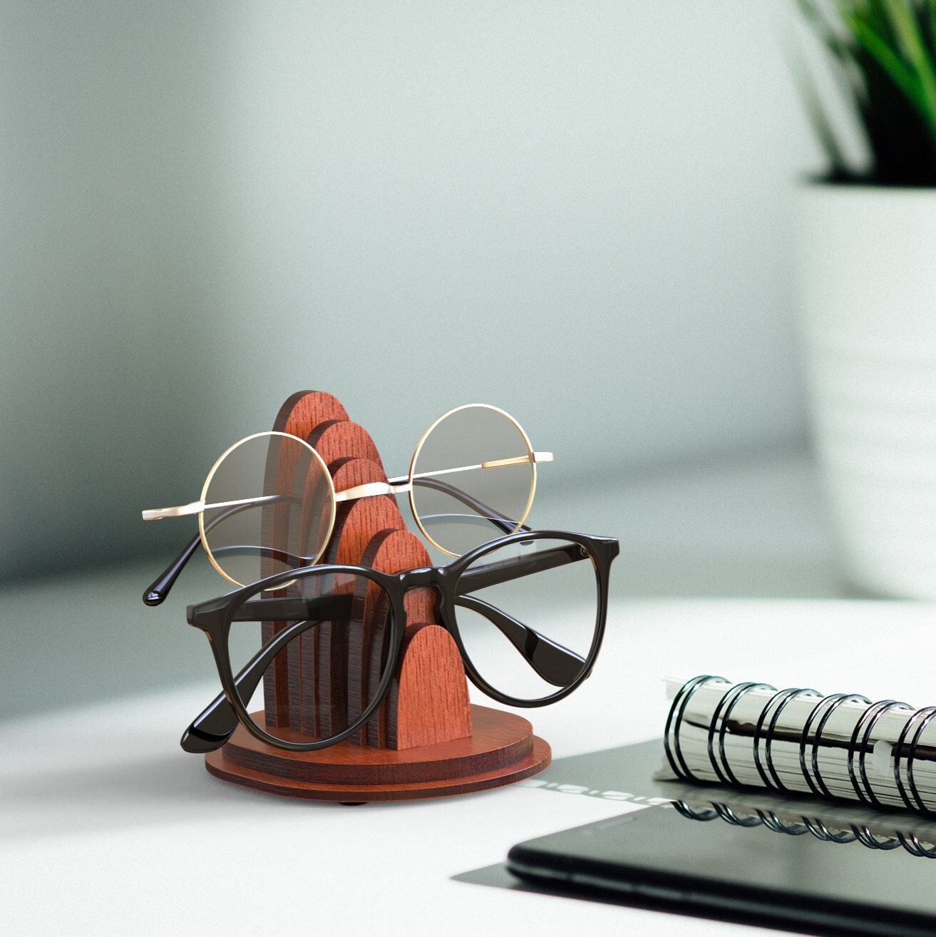 Eyeglasses stand for desk made with birch wood. It accomodates your specs easily when It’s folded and gives you the chance to display your glasses in a stylish way. It accomodates 2 glasses at once.
